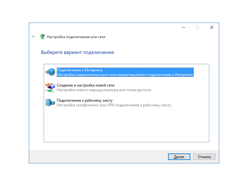 З'являється вікно Настройка подключения или сети. Обираємо Подключение к Интернету, натискаємо Далее.