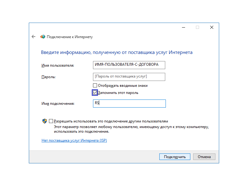 У вікні Подключение к Интернету вводимо ім'я користувача та пароль. Ставимо позначку Запомнить этот пароль, натискаємо Подключить.